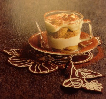 3) Mettez dans le fond de chaque verre un morceau de biscuit à la cuiller imbibé de café. Recouvrez avec un peu de crème au mascarpone. Si vos verres sont assez profonds, remettez un morceau de biscuit et de la crème. Laissez au frais au moins 1 heure0